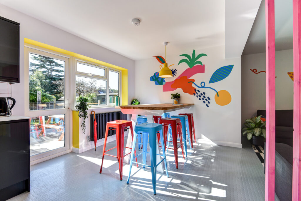 “We were excited to work on some of Joint Livings houses here in our home town of Brighton. The brief was quite open which is often trickier to approach, so we started by visiting the spaces and getting a feel for the things already there. We then set about creating a range of stand alone elements that comprised of abstract geometric and foliage inspired shapes and elements to tie them together all within our house style. The next step was putting them together as main murals and coordinate pieces to add around the building, making sure each one flowed and moved in the space it was designed for. The colour palette was inspired by a great vintage book we found on 80s fashion recently. Bright, fun and super positive!”